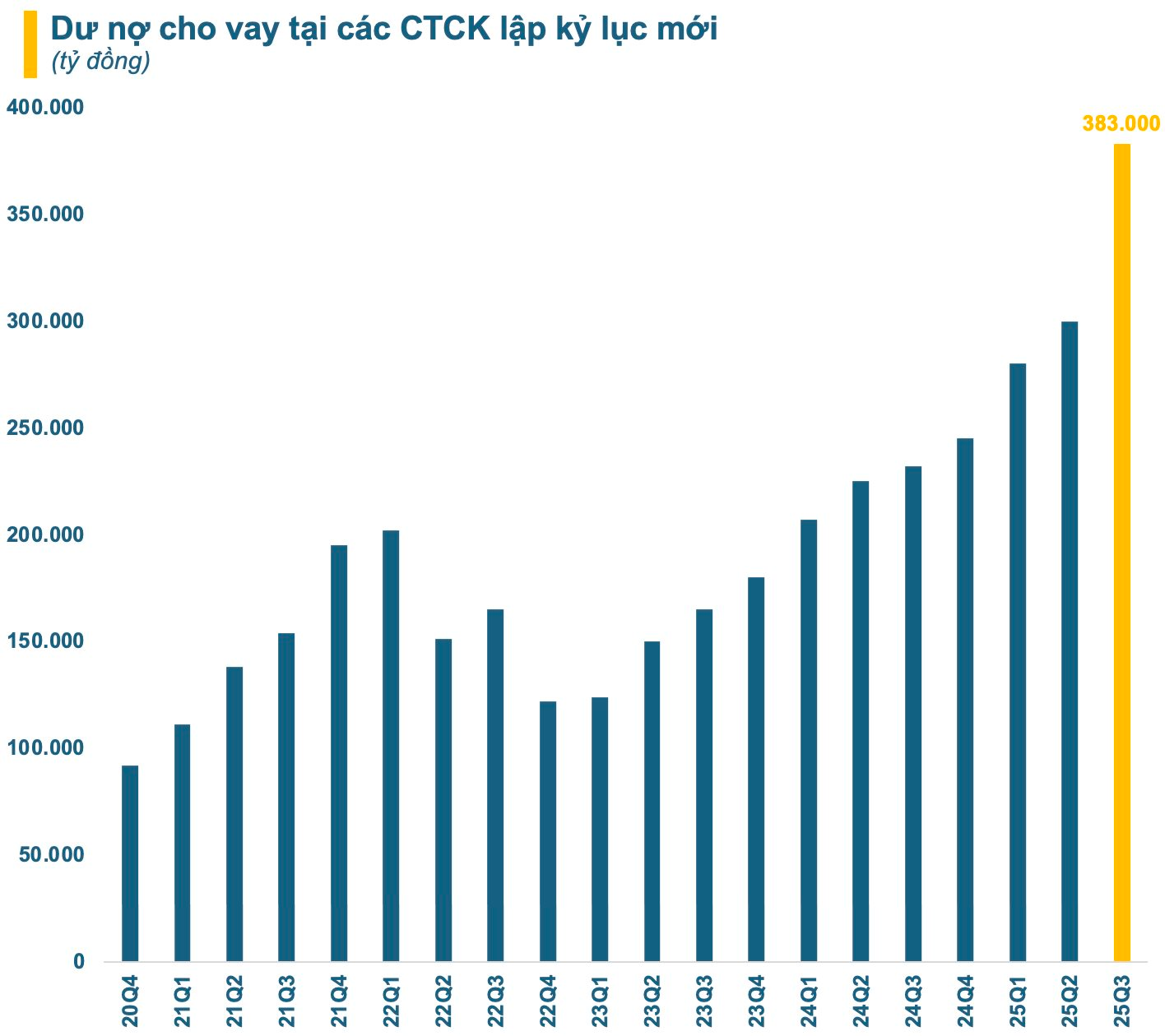 Vốn dồi dào giúp CTCK đáp ứng được nhu cầu vay ký quỹ (margin) cao chưa từng có, đồng thời cải thiện hiệu quả đầu tư, chất lượng dịch vụ… Theo thống kê, tính đến cuối quý 3/2025, dư nợ cho vay tại các CTCK ước tính vào khoảng 383.000 tỷ đồng, tăng hơn 138.000 tỷ so với cuối năm ngoái. Trong đó, dư nợ margin ước tính khoảng 370.000 tỷ đồng, mức cao kỷ lục.