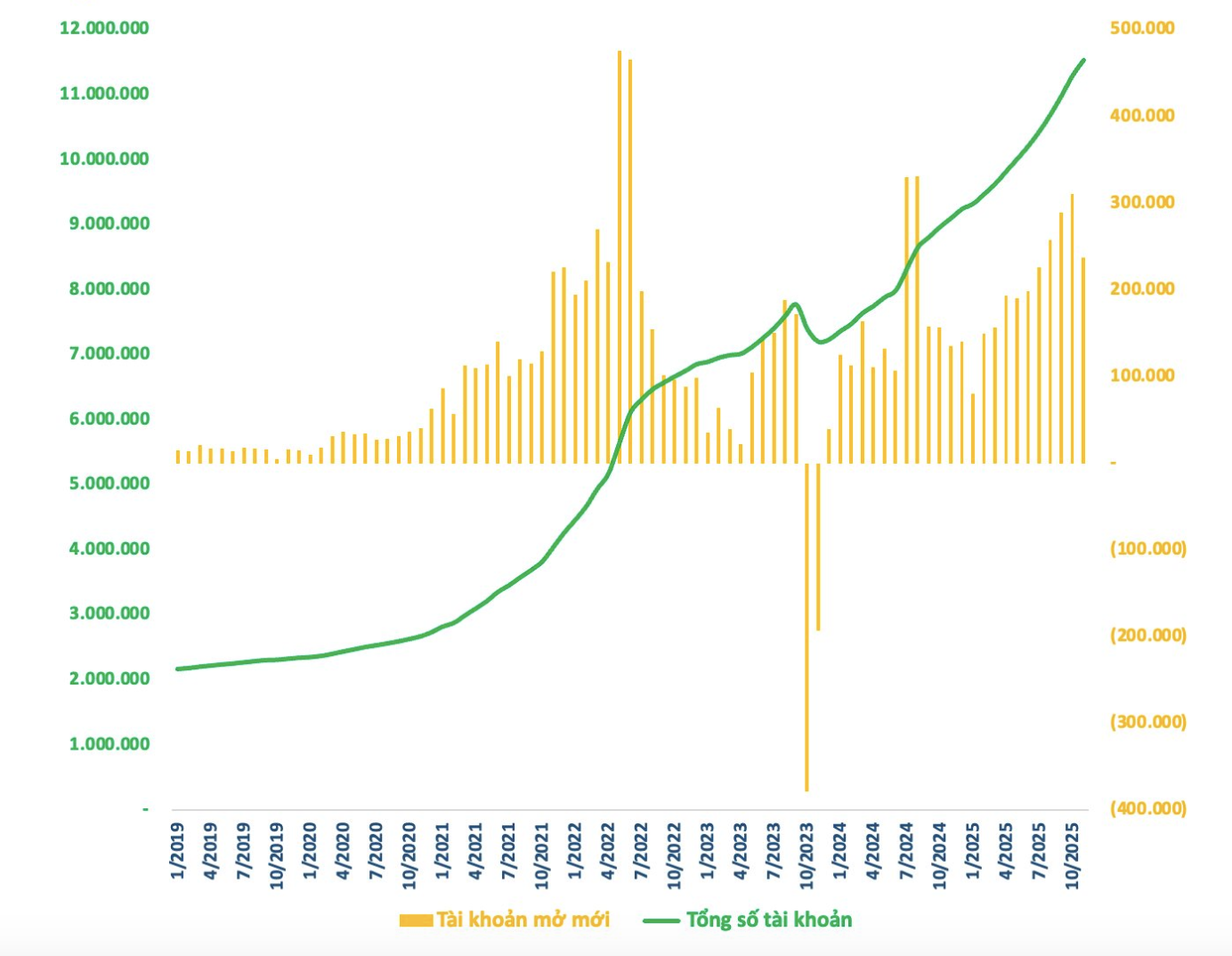 Số lượng tài khoản chứng khoán mở mới đạt khoảng 2,3 triệu tài khoản sau 11 tháng đầu năm 2025, tương đương mức kỷ lục ghi nhận trong năm 2021.