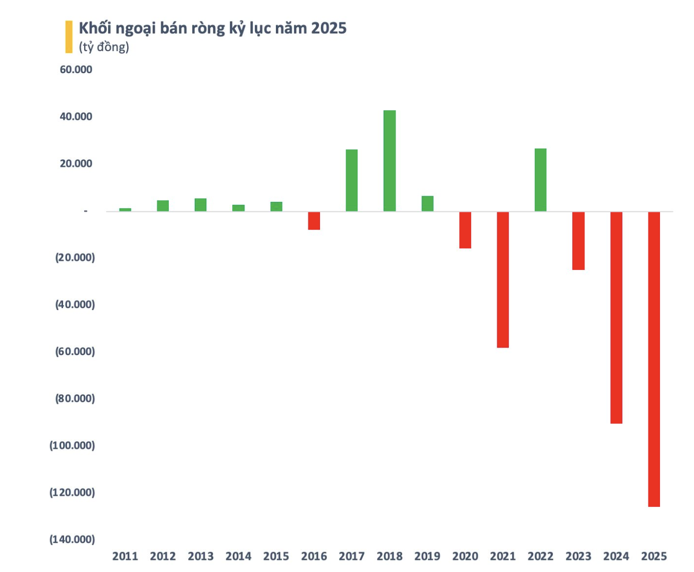 Năm 2025, khối ngoại đã bán ròng kỷ lục hơn 125.000 tỷ đồng trên HoSE. Trong các đợt cao điểm, khối ngoại rút ròng hàng nghìn tỷ mỗi phiên.