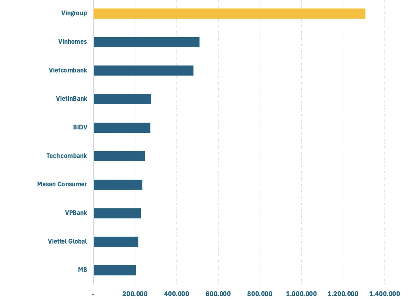 Tập đoàn Vingroup của tỷ phú Phạm Nhật Vượng có một năm bứt phá ngoạn mục khi cổ phiếu VIC tăng gấp 8 lần, vốn hóa lên đến hơn 1,3 triệu tỷ đồng. Kỷ lục này đưa Vingroup trở thành doanh nghiệp đầu tiên của Việt Nam có mức vốn hóa vượt ngưỡng 1 triệu tỷ đồng.