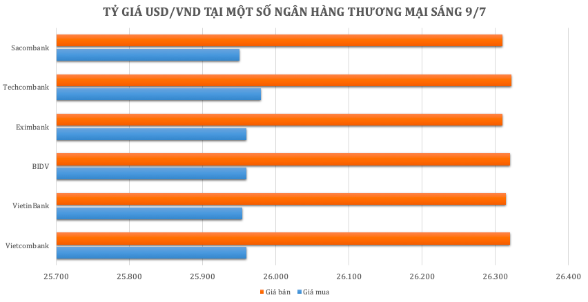 Ngân hàng Eximbank niêm yết USD ở mức 25.960 – 26.310 VND/USD, tăng 10 đồng ở chiều mua và bán so với phiên trước. Tại Techcombank, giá USD được điều chỉnh tăng 13 đồng ở chiều mua và 14 đồng chiều bán, đang niêm yết ở mức 25.980 – 26.322 VND/USD. Sacombank niêm yết USD ở mức 25.950 – 26.310 VND/USD, tăng 20 đồng chiều mua và 10 đồng chiều bán so với phiên liền trước.