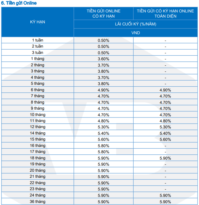 Lãi suất huy động trực tuyến cho kỳ hạn 16 - 17 tháng đang được niêm yết ở mức 5,8%/năm. Trong khi các kỳ hạn từ 18 - 36 tháng có lãi suất cao nhất, lên đến 5,9%/năm.