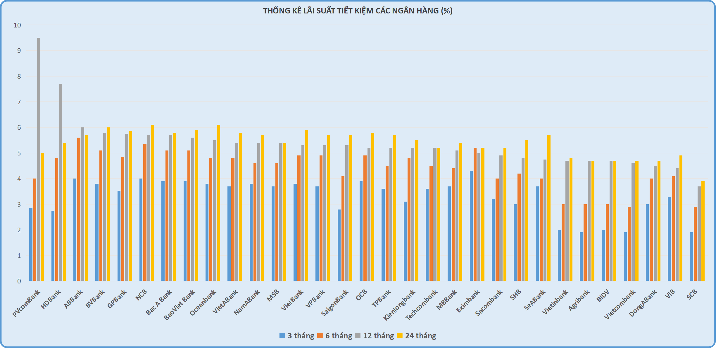 Sau điều chỉnh, các ngân hàng có lãi suất tiết kiệm trên 6%/năm là: BVBank, ABBank, HDBank, OceanBank, OCB, NCB và SHB. Cụ thể, HDBank áp dụng mức lãi suất huy động 6,1%/năm cho tiền gửi kỳ hạn 12 tháng. NCB và OceanBank niêm yết cho tiền gửi kỳ hạn 18-36 tháng và SHB niêm yết cho tiền gửi kỳ hạn từ 36 tháng. Mức lãi suất huy động 6%/năm đang được OCB niêm yết cho tiền gửi kỳ hạn dài 36 tháng, trong khi BVBank vừa áp dụng mức lãi suất này cho tiền gửi kỳ hạn từ 18-36 tháng.