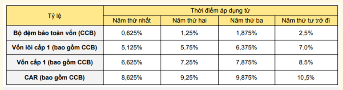 Đặc biệt, Ngân hàng Nhà nước bổ sung hai bộ đệm gồm bộ đệm bảo toàn vốn và bộ đệm vốn phản chu kỳ. Khi cộng thêm hai bộ đệm này, tỷ lệ an toàn vốn hợp nhất của các ngân hàng sẽ tăng dần theo lộ trình, từ 8,625% ngay trong năm đầu tiên lên mức 10,5% sau bốn năm.