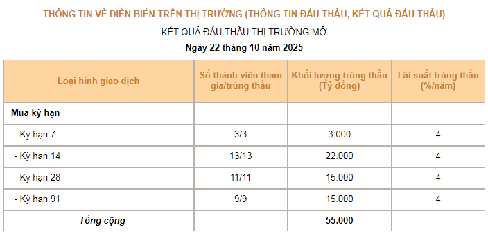 Trong phiên giao dịch ngày 22/10, Ngân hàng Nhà nước (NHNN) tăng mạnh quy mô chào thầu trên kênh cho vay cầm cố giấy tờ có giá (OMO), giữ nguyên lãi suất cố định ở mức 4,0%/năm. Kết quả, hệ thống ngân hàng trúng thầu tổng cộng gần 55.000 tỷ đồng.