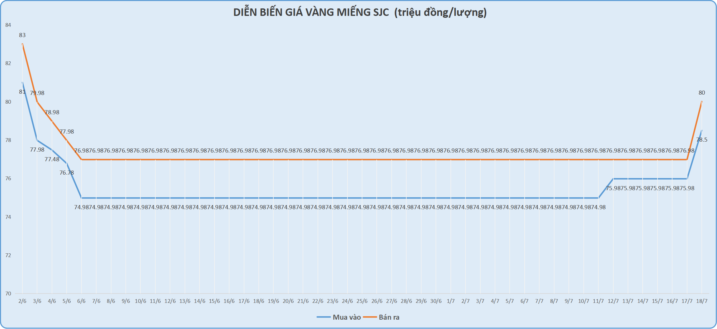 Theo thông báo của NHNN, căn cứ phương án bán vàng miếng SJC trực tiếp cho 4 Ngân hàng thương mại Nhà nước và Công ty TNHH MTV vàng bạc đá quý Sài Gòn (SJC) đã được Thống đốc NHNN phê duyệt, giá bán vàng miếng trực tiếp ngày 18/7/2024 là 79 triệu đồng/lượng.