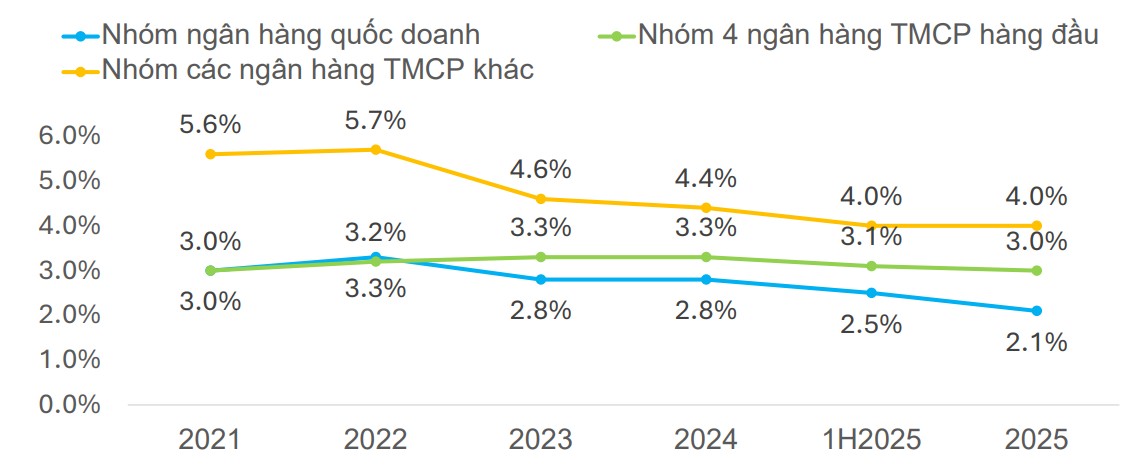 Xu hướng suy giảm NIM trong ngành ngân hàng đã kéo dài trong khoảng 2-3 năm trở lại đây. Nguyên nhân chủ yếu đến từ việc chi phí vốn tăng nhanh hơn lợi suất tài sản sinh lời, trong bối cảnh hệ thống ngân hàng duy trì mặt bằng lãi suất thấp nhằm hỗ trợ nền kinh tế phục hồi và thúc đẩy tăng trưởng.