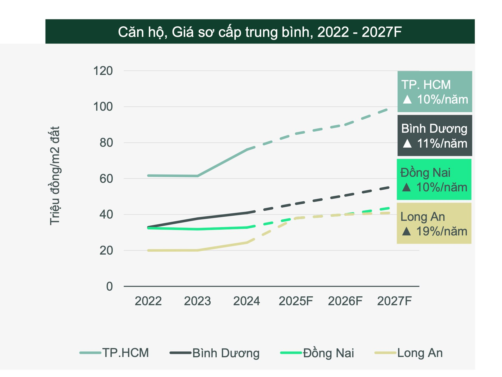 Theo CBRE, nếu giá căn hộ TP.HCM (cũ) tăng gần 30%/năm, thì căn hộ tại Bình Dương (cũ) tăng 14%/năm. Khoảng cách giá này được dự báo sẽ “xích lại” gần nhau khi 2 khu vực đã chung địa giới hành chính. Giai đoạn từ cuối năm 2025 đến 2027, giá căn hộ sơ cấp tại TP.HCM và khu vực lân cận sẽ tiếp tục đi lên. Mức tăng dự báo khoảng 10% tại TP.HCM (cũ); Tại Bình Dương (cũ), Đồng Nai, Tây Ninh lần lượt là 11%, 10%, 19%. Điều này cho thấy, mặt bằng giá mới sẽ được thiết lập tại các khu vực trong thời gian không xa.