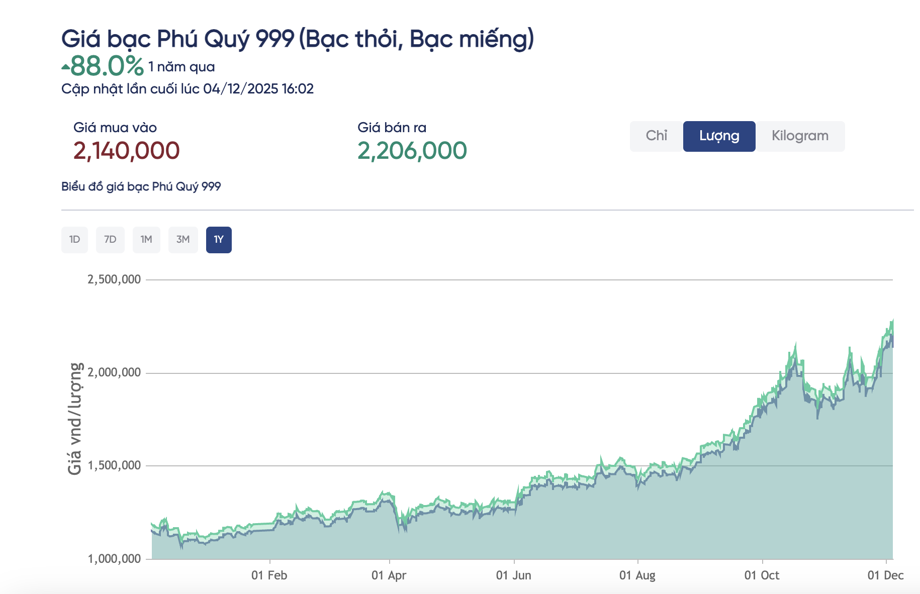 Tính đến ngày 03/12/2025, giá bạc thế giới vượt qua mức giá cao nhất mọi thời đại được xác lập trong tháng 10 và giao dịch quanh mức trên 58,39 USD/ounce. Điều này đồng nghĩa với việc giá trị của bạc đã tăng hơn 100% chỉ trong chưa đầy 12 tháng. Tại thị trường trong nước, giá bạc miếng, bạc thỏi tích lũy cũng ghi nhận mức tăng kỷ lục, bám sát đà tăng thế giới.