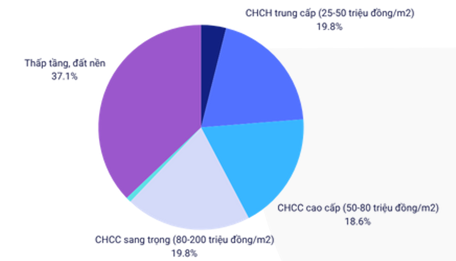 Tuy nhiên, tình trạng "lệch pha" cung cầu chưa được cải thiện, đặc biệt tại các thành phố lớn có nhu cầu về nhà ở cao như Hà Nội và TP.HCM (cũ). Hầu hết các dự án mới ra mắt đều có giá bán trên 100 triệu đồng/m2. Nguồn cung căn hộ chung cư mới tăng mạnh nhưng chủ yếu hướng đến nhóm khách hàng có khả năng tài chính mạnh với số lượng căn hộ hạng sang tăng nhanh (chiếm 33%), trong khi phân khúc căn hộ cao cấp chiếm 30%, căn hộ trung cấp chiếm 31% và căn hộ bình dân (chủ yếu là nhà ở xã hội) chỉ đạt 6%.
