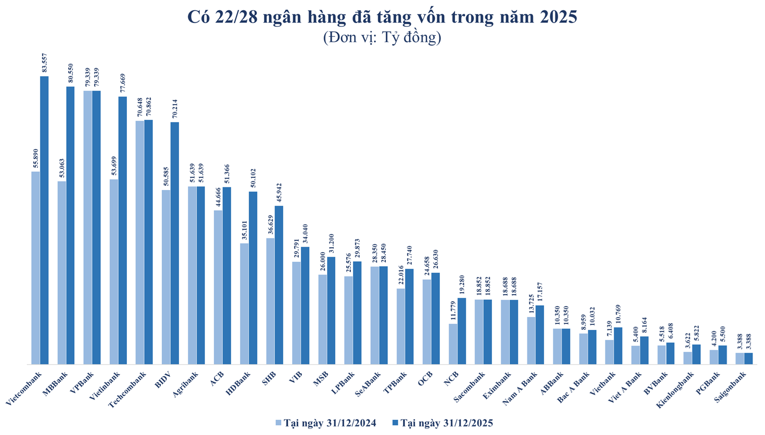 Khởi động cuộc đua tăng vốn năm 2025 là Vietcombank. Đầu năm 2025, nhà băng này đã phát hành hơn 2,76 tỷ cổ phiếu trả cổ tức với tỷ lệ 49,5%, nâng vốn điều lệ thêm 27.667 tỷ đồng, lên hơn 83.557 tỷ đồng.
