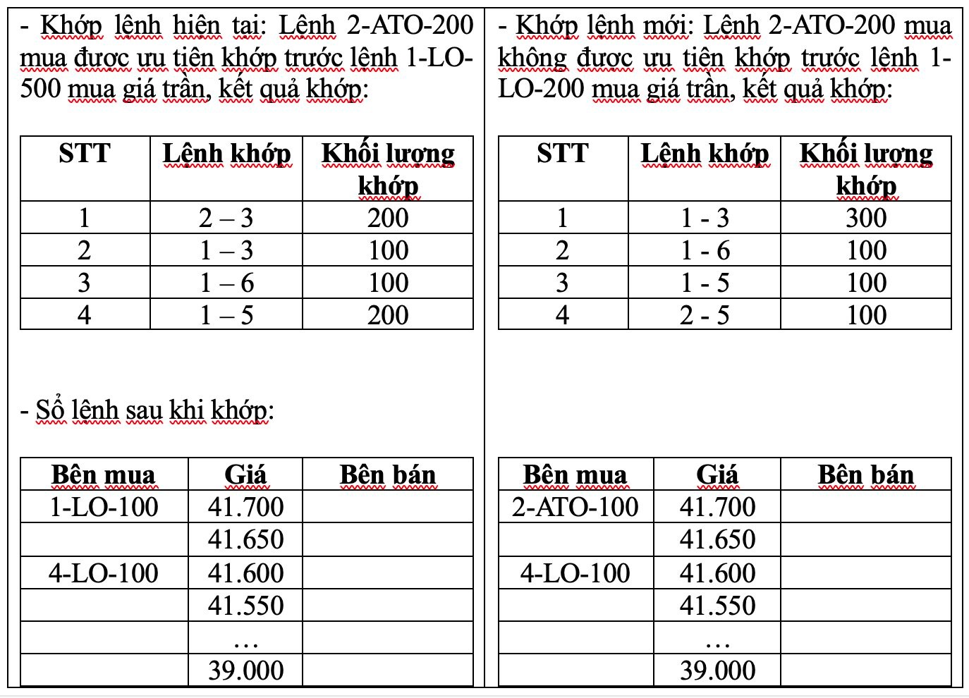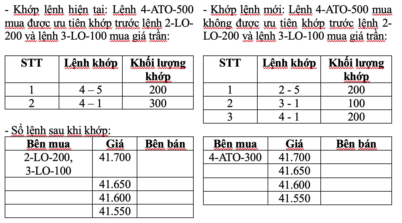 Khi áp dụng hệ thống công nghệ thông tin mới, lệnh giao dịch tại mức giá khớp lệnh xác định giá mở cửa/đóng cửa (lệnh ATO/ATC) sẽ không được ưu tiên trước lệnh giới hạn (lệnh LO) mua giá trần và lệnh giới hạn bán giá sàn đã nhập vào hệ thống trước đó khi thực hiện so khớp lệnh (hiện tại, lệnh ATO/ATC sẽ được ưu tiên trước lệnh giới hạn).