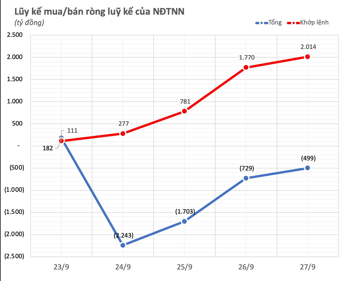 Luỹ kế sau 5 phiên, nhà đầu tư nước ngoài bán ròng 499 tỷ đồng, tuy nhiên mua ròng 2.014 tỷ trên kênh khớp lệnh và bán ròng 2.512 tỷ qua thoả thuận.
