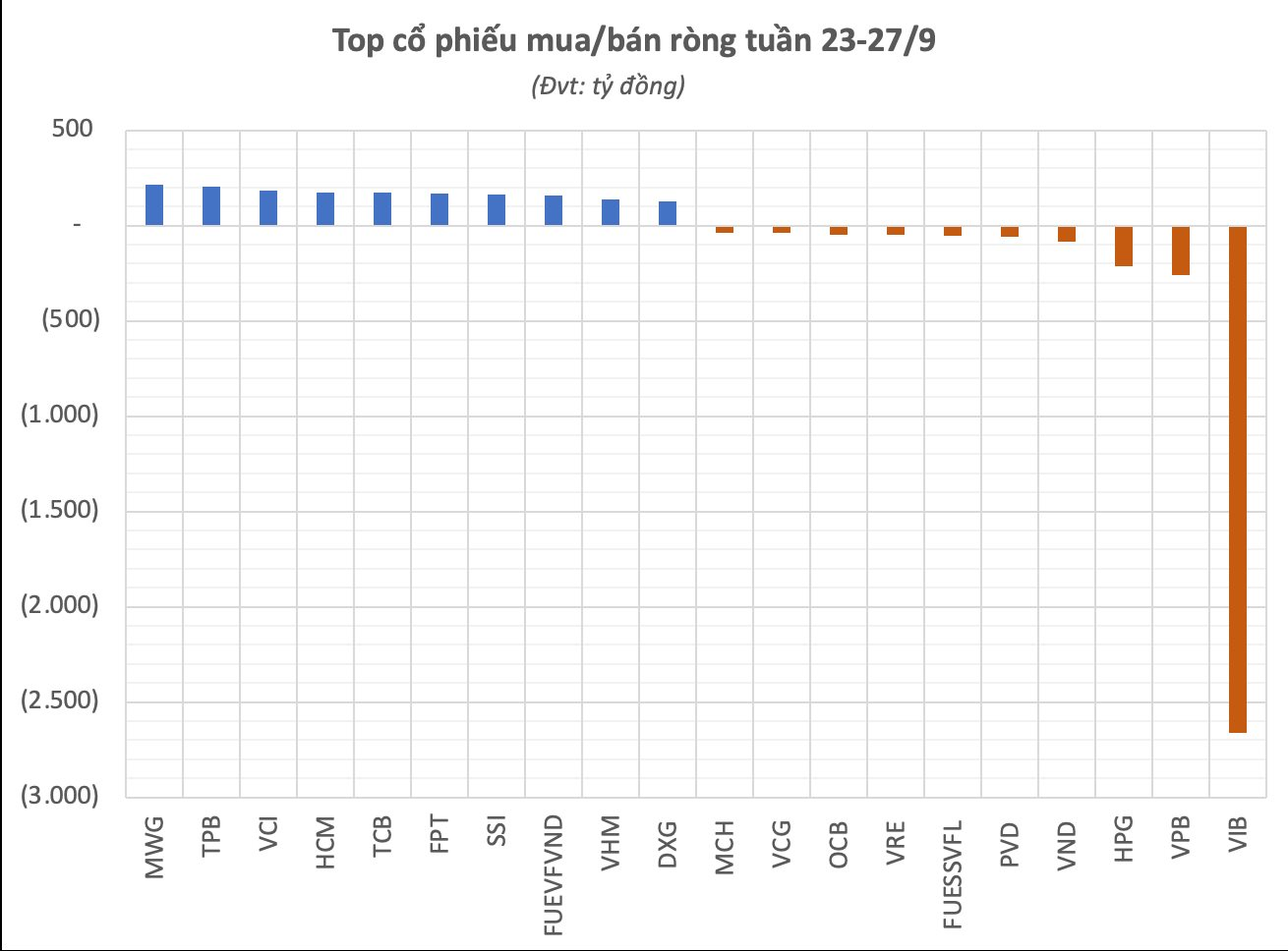 Chiều ngược lại, khối ngoại bán ròng mạnh nhất tại cổ phiếu ngân hàng VIB với giá trị đột biến 2.664 tỷ, toàn bộ là bán thoả thuận. Trong một diễn biến mới nhất, Ủy ban Chứng khoán Nhà nước đã chấp thuận VIB điều chỉnh tỷ lệ sở hữu nước ngoài (room ngoại) tối đa giảm xuống còn 4,99% (tương ứng 126,6 triệu cổ phiếu), có hiệu lực từ ngày 1/7.