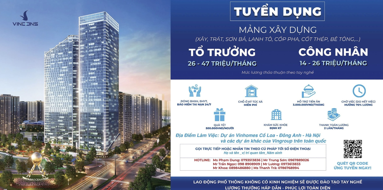 Theo thông báo của Vincons, tổng thầu xây dựng trực thuộc Vinhomes, doanh nghiệp đang có nhu cầu tuyển dụng 50.000 công nhân, với dải thu nhập công bố tới 47 triệu đồng/tháng kèm phúc lợi "bao ăn ở". Đợt tuyển dụng cũng bao gồm nhiều vị trí kỹ sư và kỹ thuật viên khác.