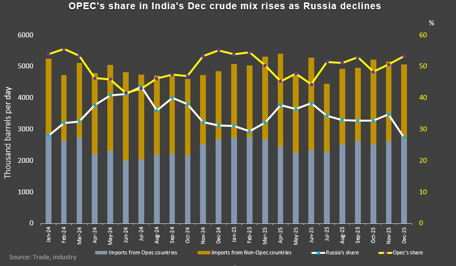 Nhìn rộng hơn vào bức tranh toàn cảnh của năm 2025, xu hướng phục hồi của OPEC tại thị trường Ấn Độ vẫn rất rõ nét. Thị phần dầu thô nhập khẩu từ các quốc gia OPEC đã tăng nhẹ lên mức 50% trong năm 2025, so với con số 49% của năm 2024. Cùng thời điểm đó, thị phần của Nga đã giảm xuống còn 33,3% so với mức 36% của năm trước.