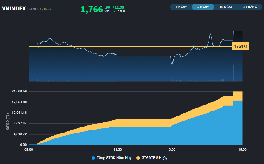 Biên độ tăng điểm của VN-Index bằng một nửa của phiên hôm qua. Chỉ số tăng 12,06 điểm lên 1.766,9 điểm (+0,69%). Tổng khối lượng giao dịch sàn đạt 637 triệu đơn vị, tương đương 20.571 tỷ đồng.