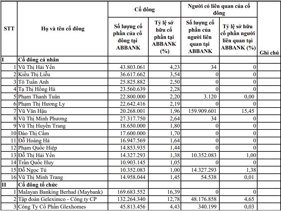 Danh sách cổ đông sở hữu trên 1% vốn điều lệ tại ABBank - Nguồn: ABBank