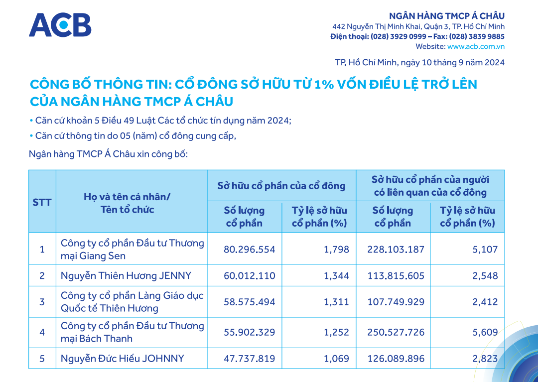 Ngân hàng TMCP Á Châu (ACB) vừa bổ sung danh sách cổ đông sở hữu trên 1% vốn điều lệ của ngân hàng.