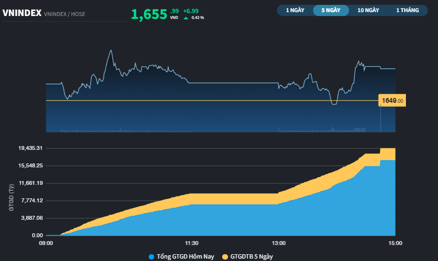 Với nhiều tín hiệu tươi mới hơn, VN-Index chỉ gặp rung lắc 1 lần trong phiên. Chốt phiên, chỉ số tăng 6,99 điểm lên 1.655,99 điểm. Tổng giá trị giao dịch sàn đạt 19.052 tỷ đồng.