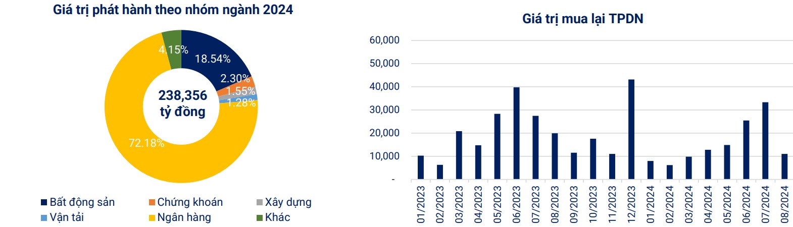 Lũy kế 8 tháng đầu năm 2024, có 227 đợt phát hành riêng lẻ trị giá 215.583 tỷ đồng và 13 đợt phát hành ra công chúng trị giá 22.773 tỷ đồng. Trong đó, trái phiếu do nhóm ngân hàng phát hành chiếm hơn 72%, tiếp đến là bất động sản với gần 19%.