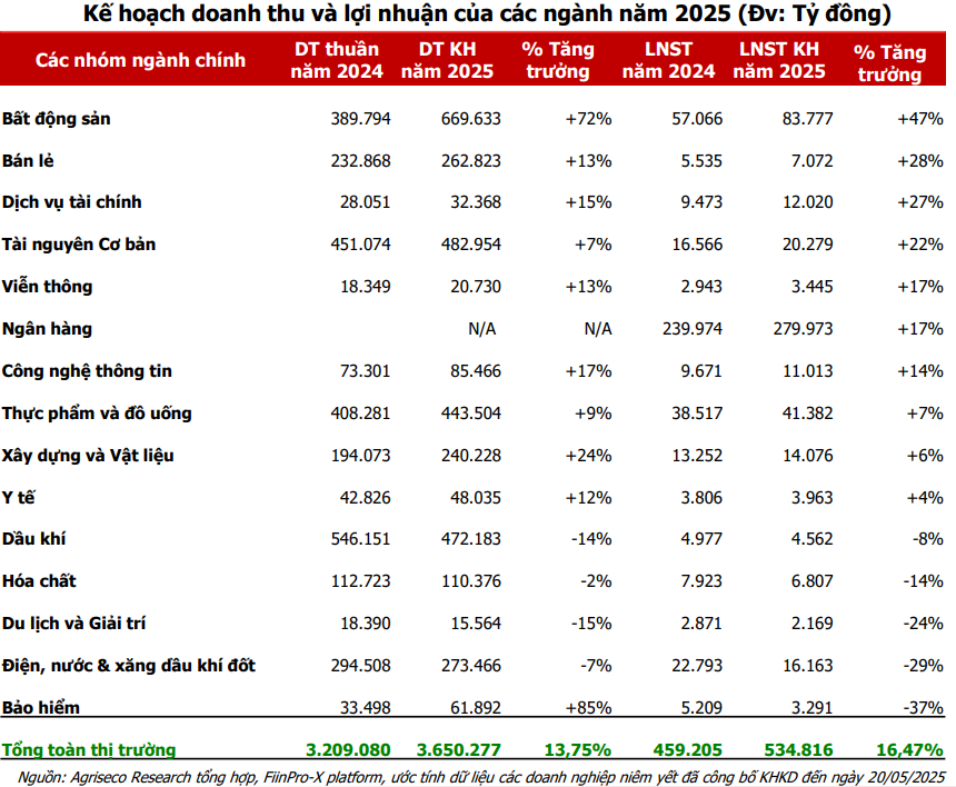 Dựa trên số liệu của tổng hợp về kế hoạch kinh doanh năm 2025 của các doanh nghiệp công bố đến ngày 20/5/2025 (đại diện cho 87% vốn hóa thị trường), Agriseco ước tính lợi nhuận ròng toàn thị trường năm 2025 tăng trưởng 16,47% so với năm 2024 và tổng doanh thu kế hoạch (không bao gồm nhóm ngân hàng) tăng 13,75% so với năm ngoái.