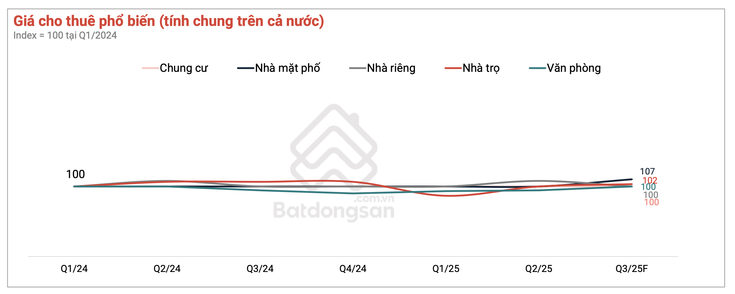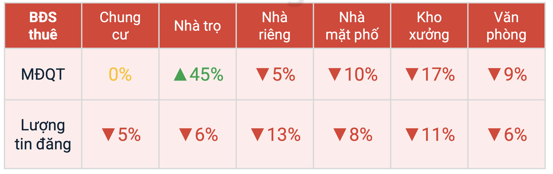 Theo đó, nhu cầu nhà trọ cả nước ghi nhận tăng 45% so với tháng 7/2025. Trong khi các loại hình như chung cư, nhà riêng, nhà mặt phố, kho xưởng, văn phòng… mức độ quan tâm trong tháng 8/2025 đều giảm so với tháng trước đó.