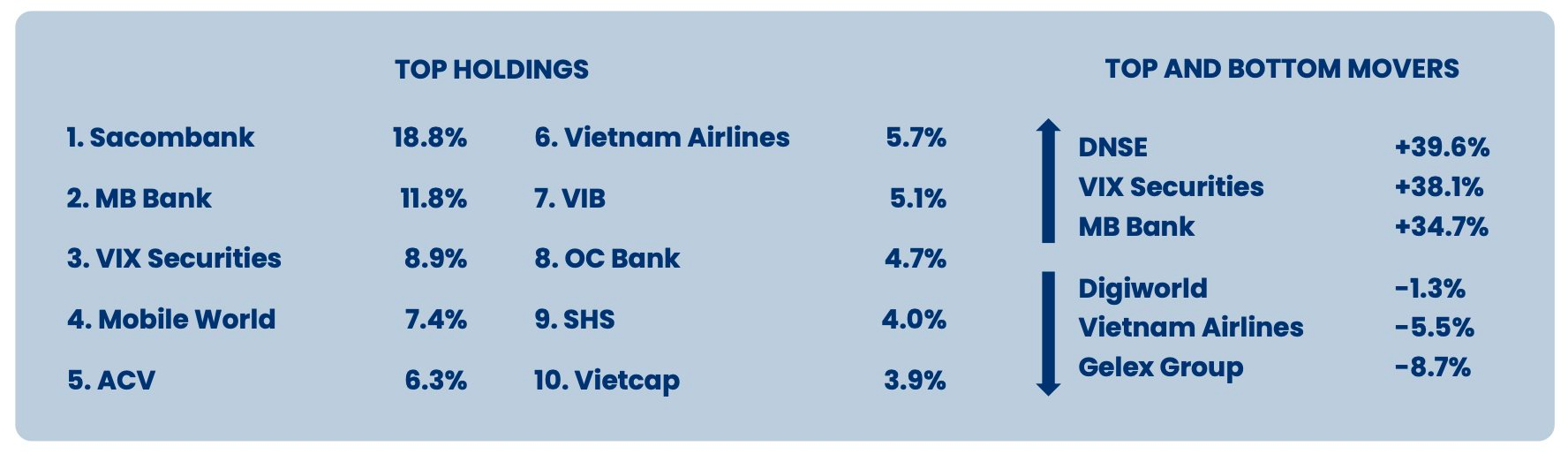 Riêng với cổ phiếu ngân hàng chiến tỷ trọng lớn nhất danh mục là STB, quỹ ngoại đánh giá cổ phiếu này bắt đầu năm với tư cách là một trong ba ngân hàng có hiệu suất hoạt động tốt nhất, được thúc đẩy bởi kỳ vọng xung quanh phiên đấu giá cổ phần VAMC và những thay đổi về quyền sở hữu tiềm năng. Tuy nhiên, trong hai tháng qua, khoảng cách hiệu suất vượt trội so với các ngân hàng cùng ngành đã thu hẹp, khi các nhà đầu tư chờ đợi quá trình tái cấu trúc thực sự.