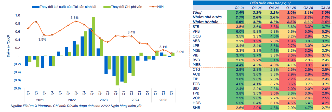 Biên lợi nhuận ròng (NIM) toàn ngành ngân hàng trong quý III/2025 đã giảm về mức 3,0%, thấp nhất kể từ quý IV/2018 trong bối cảnh các ngân hàng thương mại chấp nhận giảm NIM để theo đuổi mục tiêu tăng sức cạnh tranh và duy trì mặt bằng lãi suất cho vay thấp nhằm thu hút thêm khách hàng mới và giữ chân khách hàng hiện hữu.
