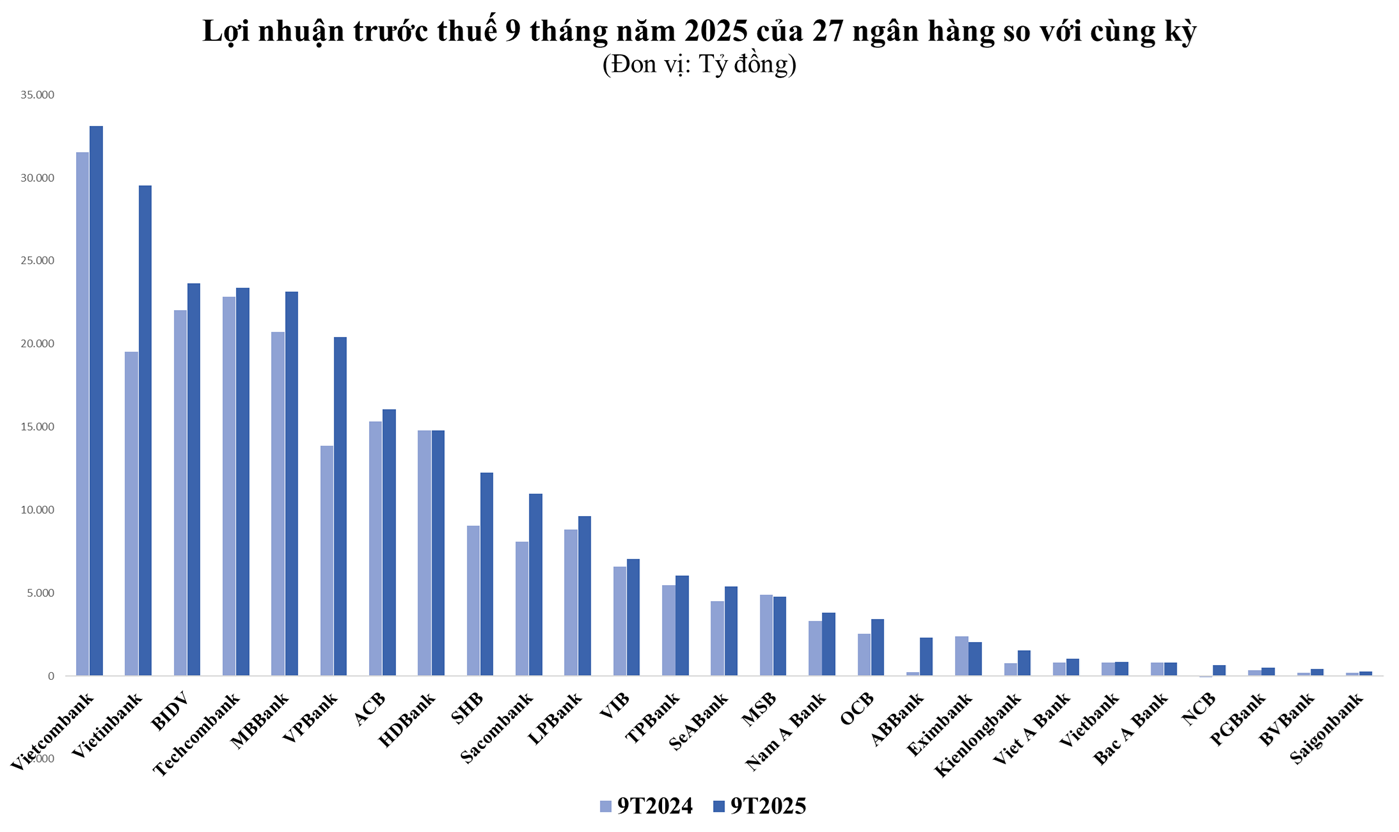Dữ liệu tổng hợp từ báo cáo tài chính quý III/2025 của các ngân hàng cho thấy, lợi nhuận sau thuế của ngành ngân hàng trong quý III tăng 24,9% so với cùng kỳ và là mức tăng cao nhất trong 7 quý gần đây nhờ thu nhập ngoài lãi tăng mạnh (đáng chú ý tại VPBank, Vietinbank, SHB) và chi phí dự phòng giảm (tại Vietinbank, Sacombank, BVBank, OCB).