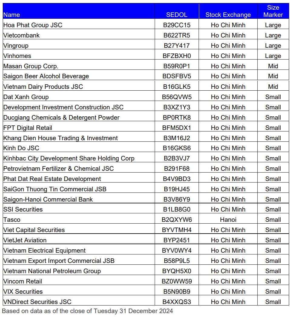 Danh sách được đưa ra dựa trên dữ liệu ngày 31/12/2024 và có thể sẽ có sự thay đổi vào thời điểm công bố chính thức. Danh sách cuối cùng sẽ được công bố trước kỳ đánh giá bán niên FTSE GEIS tháng 9 năm 2026. Việc đưa cổ phiếu Việt Nam vào rổ dự kiến sẽ được thực hiện theo nhiều đợt. Chi tiết về việc triển khai theo từng giai đoạn sẽ được thông báo vào tháng 3/2026, sau khi tham khảo ý kiến của các Ủy ban Cố vấn FTSE Russell và các bên tham gia thị trường, và được Hội đồng Quản trị FTSE Russell Index phê duyệt cuối cùng