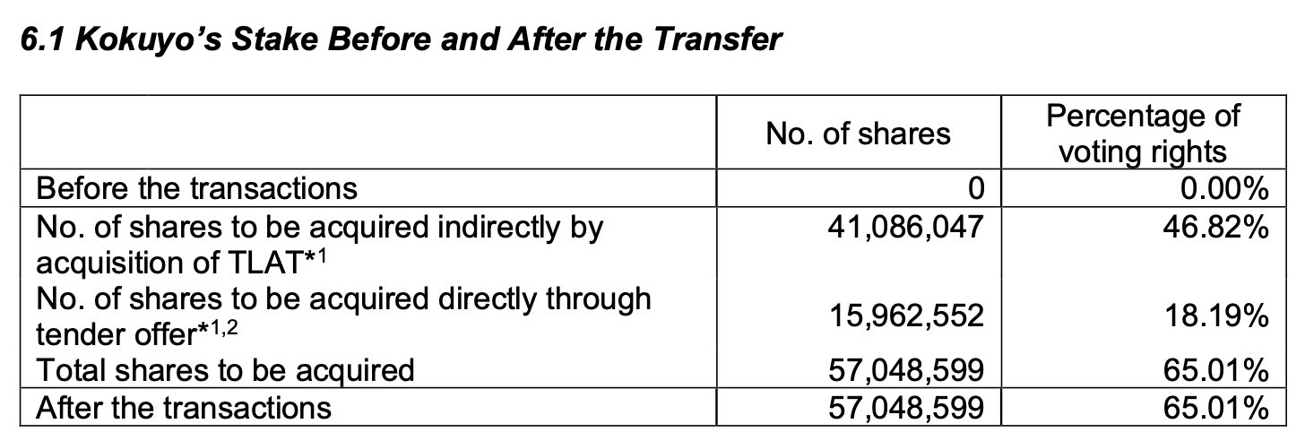Ngay sau đó, tập đoàn Nhật sẽ thực hiện chào mua công khai thêm 18,19% cổ phần Thiên Long trên thị trường. Nếu thành công, Kokuyo sẽ nắm tổng cộng 65,01% cổ phần, chính thức biến Thiên Long thành công ty con.