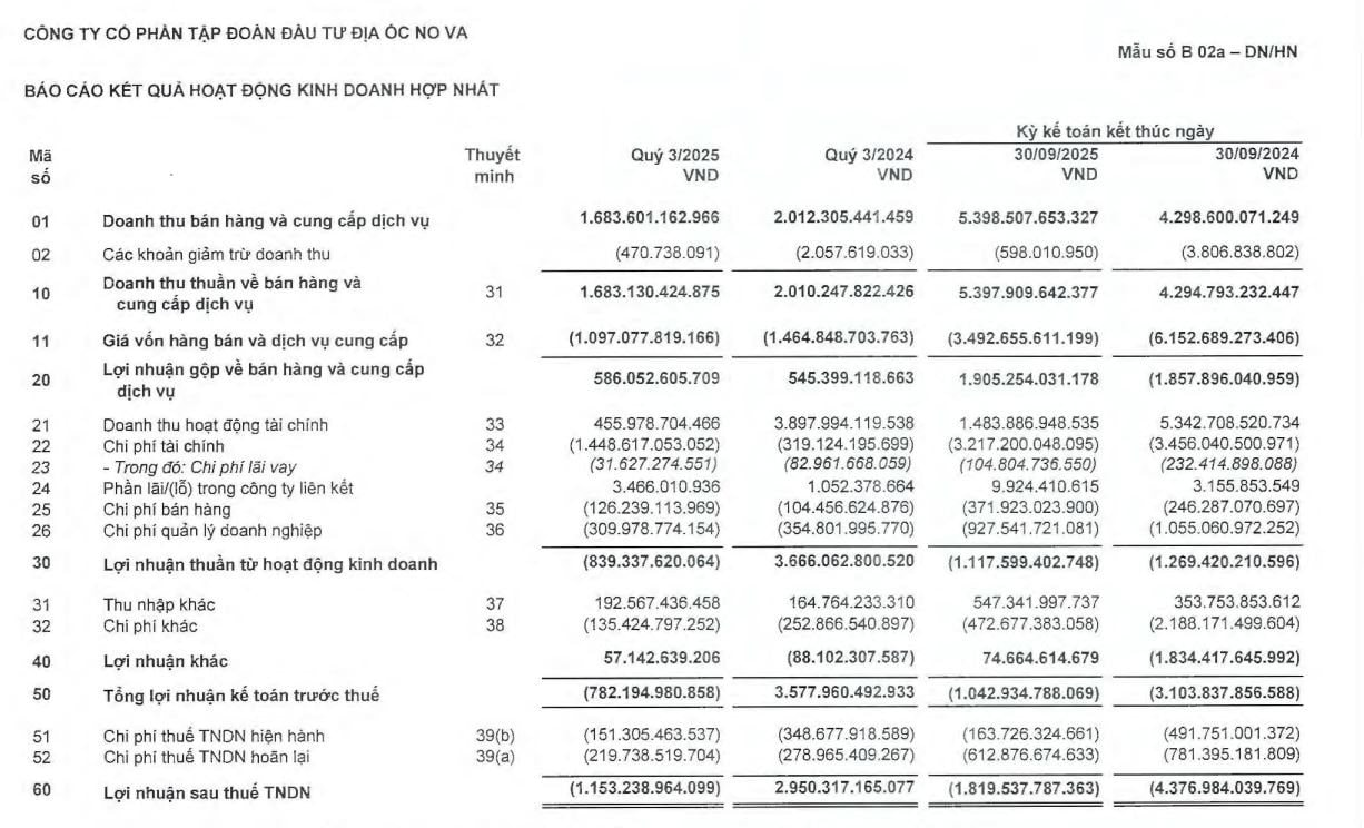 Lũy kế 9 tháng đầu năm, Novaland ghi nhận tổng doanh thu thuần hợp nhất đạt 5.398 tỷ đồng. Trong đó, doanh thu thuần từ bán hàng đạt gần 4.956 tỷ đồng, tăng 33% so với cùng kỳ, được ghi nhận từ việc bàn giao tại các dự án như NovaWorld Phan Thiet, NovaWorld Ho Tram, Aqua City, Sunrise Riverside, Palm City... Tuy nhiên, Novaland lỗ 1.820 tỷ đồng, chủ yếu do giảm doanh thu hoạt động tài chính.