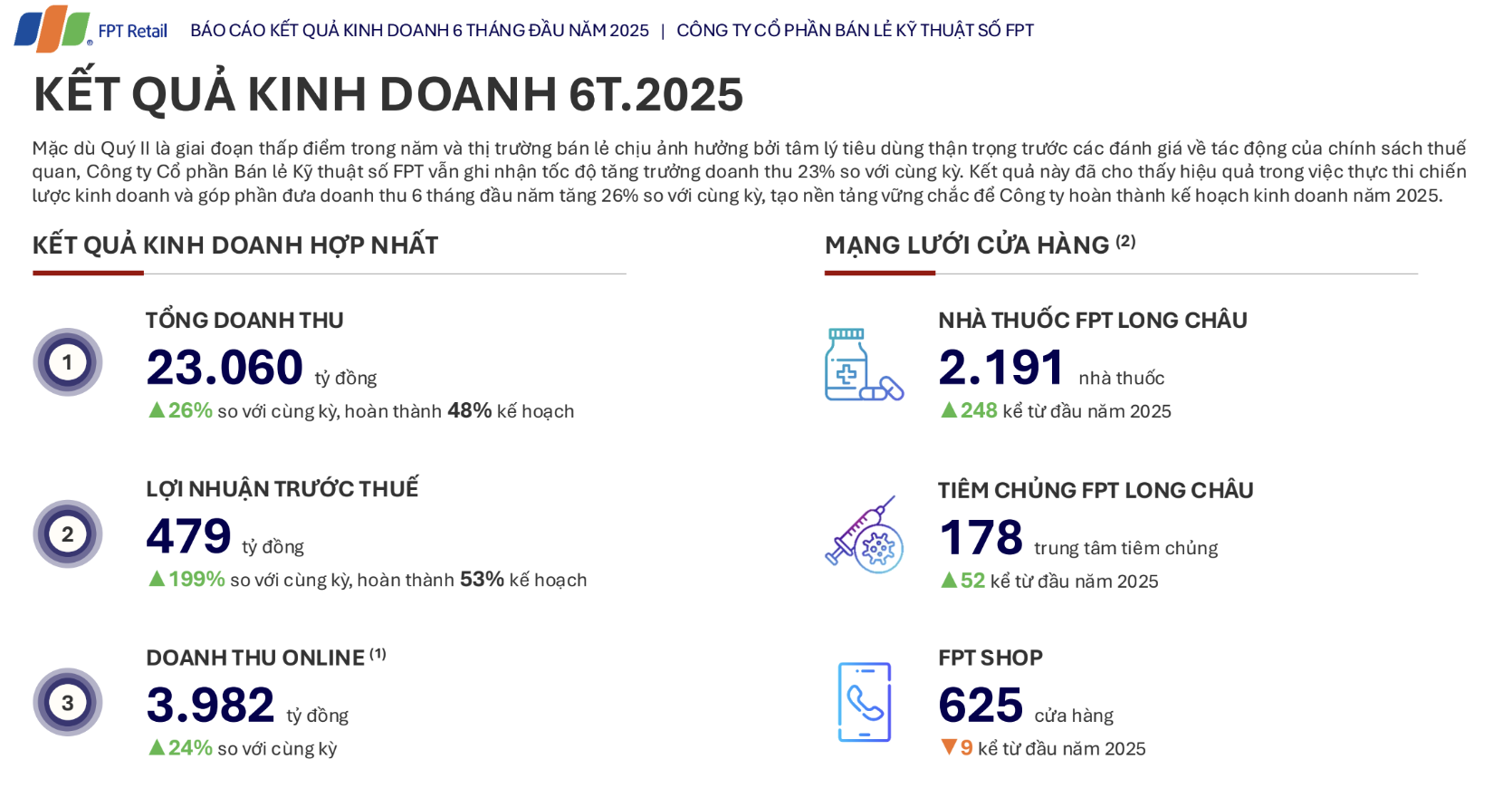 Kết thúc nửa đầu năm 2025, FPT Retail đã hoàn thành 48% kế hoạch doanh thu và 53% kế hoạch lợi nhuận trước thuế. Bên cạnh đó, doanh thu online toàn công ty đạt 3.982 tỷ đồng, tăng 24%.
