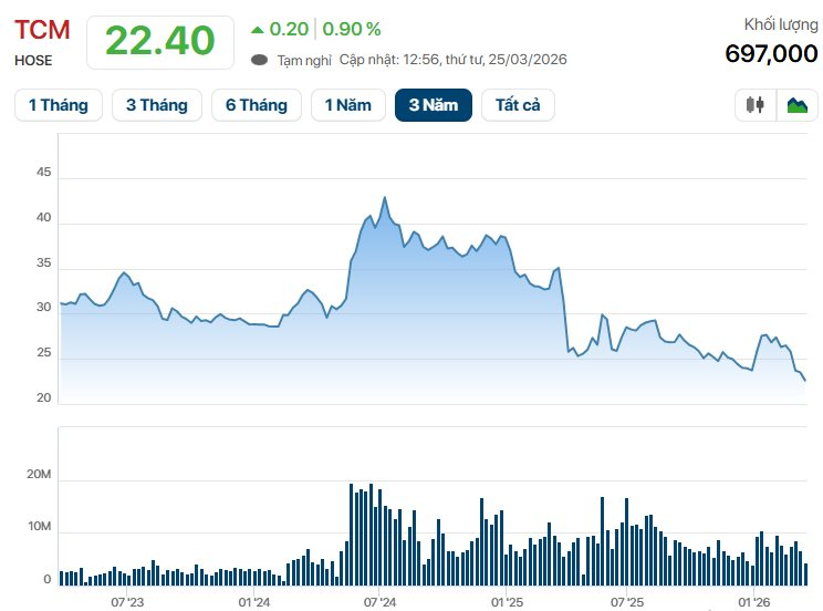 Về tình hình kinh doanh, lũy kế cả năm 2025, TCM ghi nhận doanh thu hơn 3.644 tỷ đồng, giảm hơn 4% so với năm 2024 và thực hiện khoảng 81% kế hoạch năm. Lãi ròng đạt hơn 269 tỷ đồng, giảm gần 3% và hoàn thành hơn 96% mục tiêu lợi nhuận đề ra.