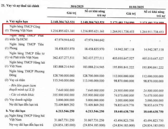 Tính tới ngày 30/6/2025, Đầu tư Thương mại SMC đang có dư nợ vay lên tới hơn 2.300 tỷ đồng, gấp 4 lần vốn chủ sở hữu. Trong đó, nợ vay ngắn hạn là gần 2.150 tỷ đồng và nợ vay dài hạn là gần 180 tỷ đồng.