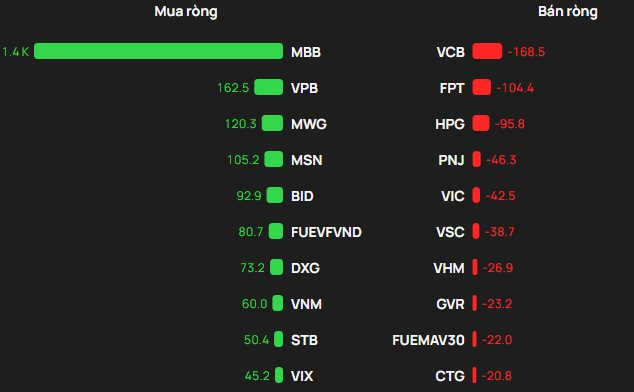 Ở chiều mua, khối ngoại bất ngờ mua ròng cổ phiếu MBB với giá trị đột biến khoảng 1.400 tỷ đồng, theo sau là VPB (khoảng 163 tỷ) và MWG (xấp xỉ 120 tỷ). Hai mã còn lại trong top 5 được khối ngoại gom ròng mạnh là MSN (khoảng 105 tỷ) và BID (khoảng 93 tỷ).
