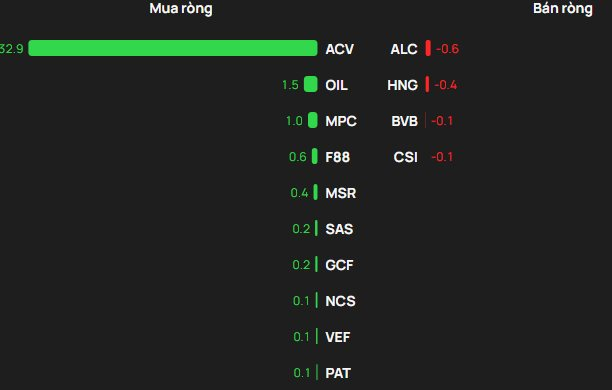 Chiều mua ghi nhận ACV dẫn đầu với giá trị mua ròng khoảng 33 tỷ đồng, bỏ xa nhóm còn lại gồm OIL (khoảng 1,5 tỷ), MPC (xấp xỉ 1 tỷ), F88 (khoảng 0,6 tỷ) và MSR (khoảng 0,4 tỷ) trong top 5.