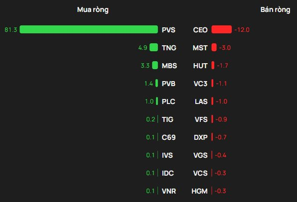 Tại chiều mua, PVS được mua ròng mạnh nhất với giá trị 81 tỷ đồng. Bên cạnh đó, TNG xếp tiếp theo trong sách mua ròng mạnh trên HNX với 5 tỷ đồng. Ngoài ra, khối ngoại cũng chi vài tỷ đồng để gom ròng MBS, PVB, PLC.