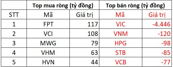 Chiều bán, cổ phiếu VIC bị bán ròng đột biến 4.446 tỷ đồng, chủ yếu qua thỏa thuận. Theo sau, các mã khác cũng bị bán ròng hàng chục tới hơn trăm tỷ đồng còn có VNM (-120 tỷ); HPG (-98 tỷ); STB (-85 tỷ),...