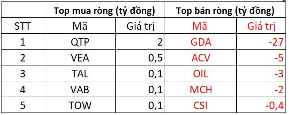 Ngược chiều, cổ phiếu GDA bị xả mạnh 27 tỷ, ACV, OIL và MCH cũng bị bán ròng 2-5 tỷ đồng mỗi mã; CSI cùng bị bán ròng khoảng 400 triệu đồng.