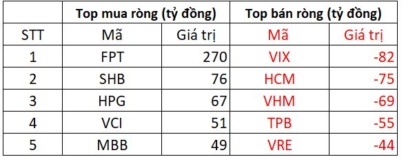 Ngược chiều, cổ phiếu FPT được mua ròng mạnh nhất toàn thị trường với giá trị lên tới 270 tỷ đồng. Ngoài ra, cổ phiếu SHB, HPG, VCI và MBB đồng loạt được mua ròng từ 49 tỷ tới 76 tỷ đồng.