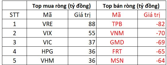 Ngược chiều, cổ phiếu "họ" Vingroup là VRE, VIC và VHM nằm top các mã được mua ròng mạnh với giá trị lần lượt 88 tỷ, 37 tỷ và 36 tỷ đồng. Theo sau, cổ phiếu VIX và HPG được mua ròng khoảng 36-55 tỷ đồng mỗi mã.