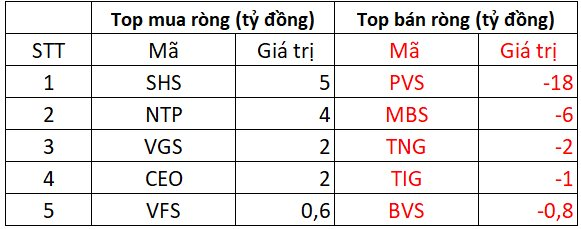 Chiều ngược lại, cổ phiếu PVS bị bán ròng mạnh 18 tỷ đồng; MBS, TNG và TIG cũng bị bán ròng với giá trị từ 1 tỷ tới 6 tỷ đồng.