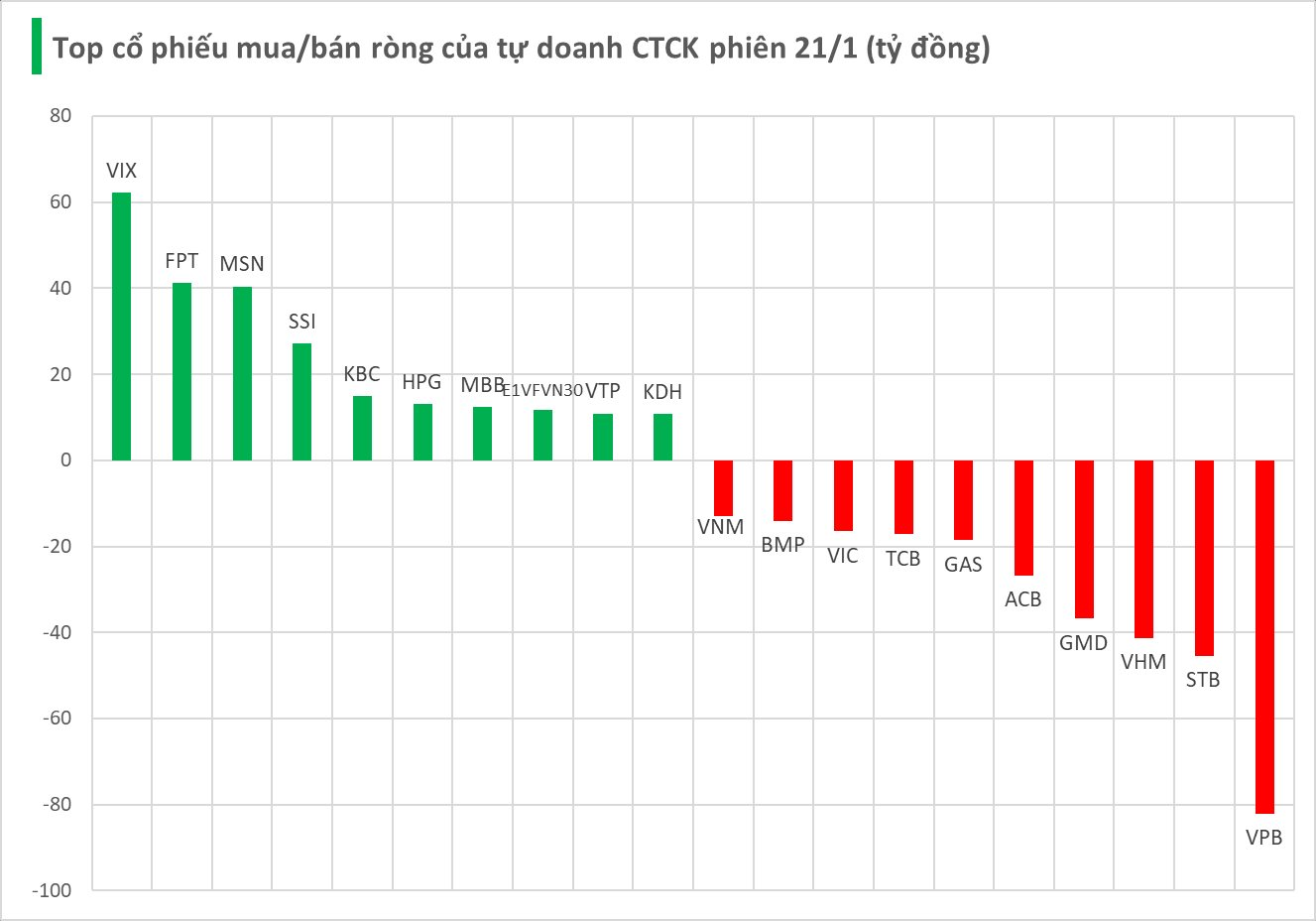 Cụ thể, nhóm tự doanh CTCK bán ròng mạnh nhất tại VPB với giá trị -82 tỷ đồng, tiếp theo là STB (-45 tỷ), VHM (-41 tỷ), GMD (-37 tỷ) và ACB (-27 tỷ đồng). Một số cổ phiếu khác cũng ghi nhận lực bán ròng đáng kể như GAS (-19 tỷ), TCB (-17 tỷ), VIC (-16 tỷ), BMP (-14 tỷ) và VNM (-13 tỷ đồng).