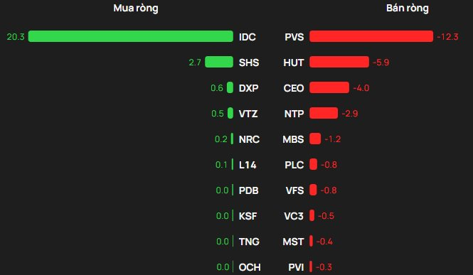 Ở chiều bán, PVS bị bán ròng mạnh nhất với khoảng 12 tỷ đồng, tiếp đến là HUT khoảng 6 tỷ đồng, CEO khoảng 4 tỷ đồng, NTP khoảng 3 tỷ đồng và MBS khoảng 1 tỷ đồng.