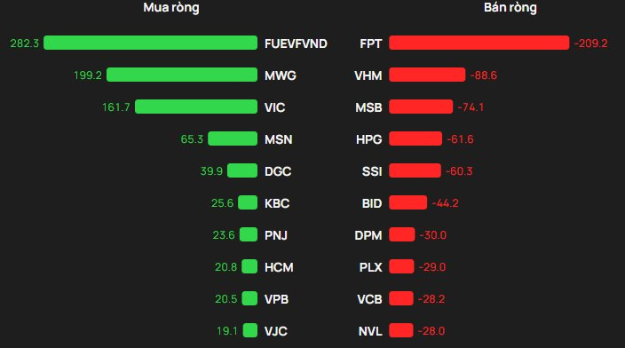Ở chiều ngược lại, áp lực bán ròng tập trung mạnh nhất tại FPT với giá trị khoảng 209 tỷ đồng. Theo sau là VHM với khoảng 89 tỷ đồng, MSB khoảng 74 tỷ đồng, HPG khoảng 62 tỷ đồng và SSI khoảng 60 tỷ đồng.