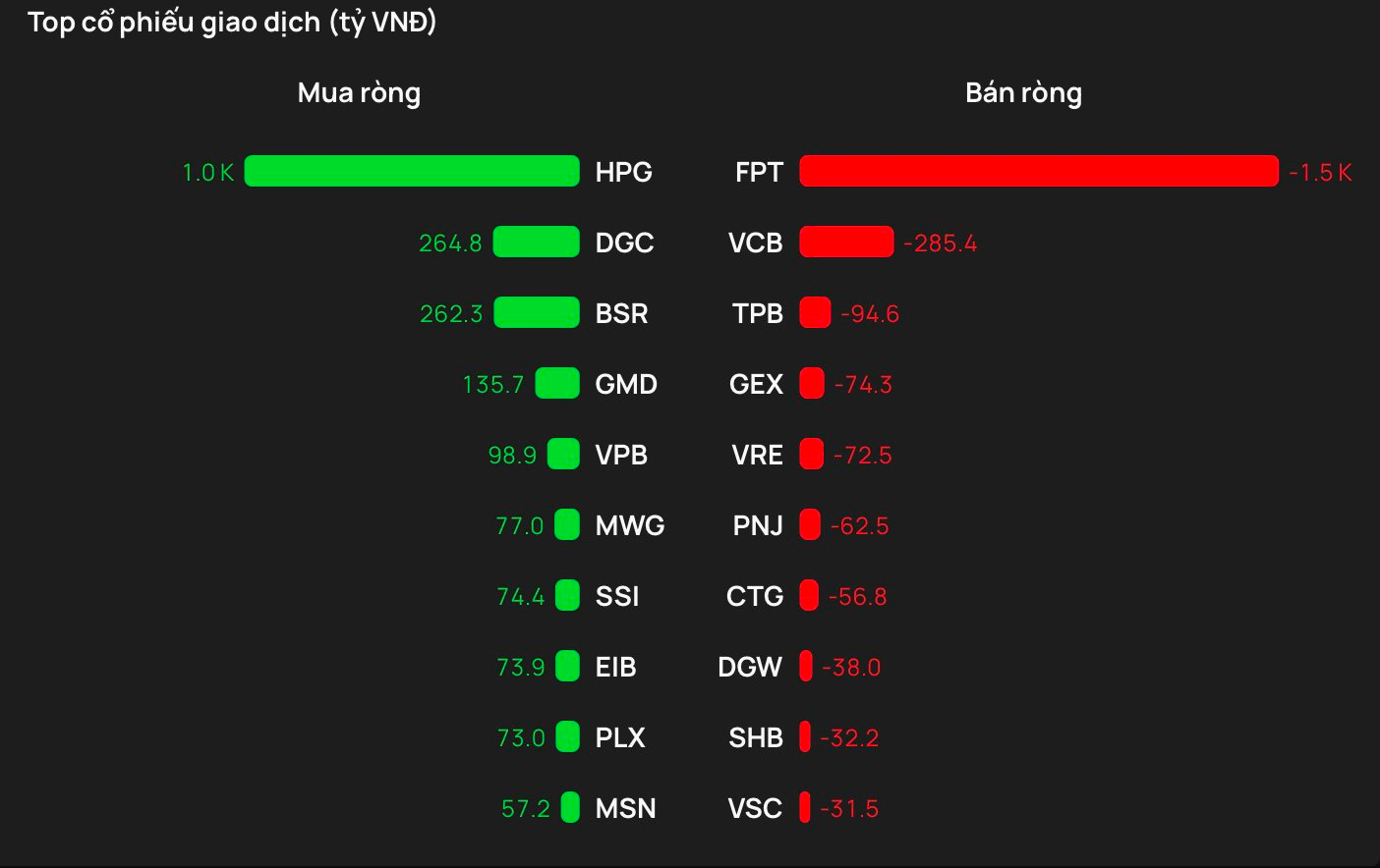 Tại chiều mua, cổ phiếu HPG được khối ngoại mua mạnh nhất trên HOSE với giá trị hơn 1.000 tỷ đồng. Theo sau, DGC và BSR là mã tiếp theo được gom mạnh 264 tỷ đồng và 262 tỷ đồng.
