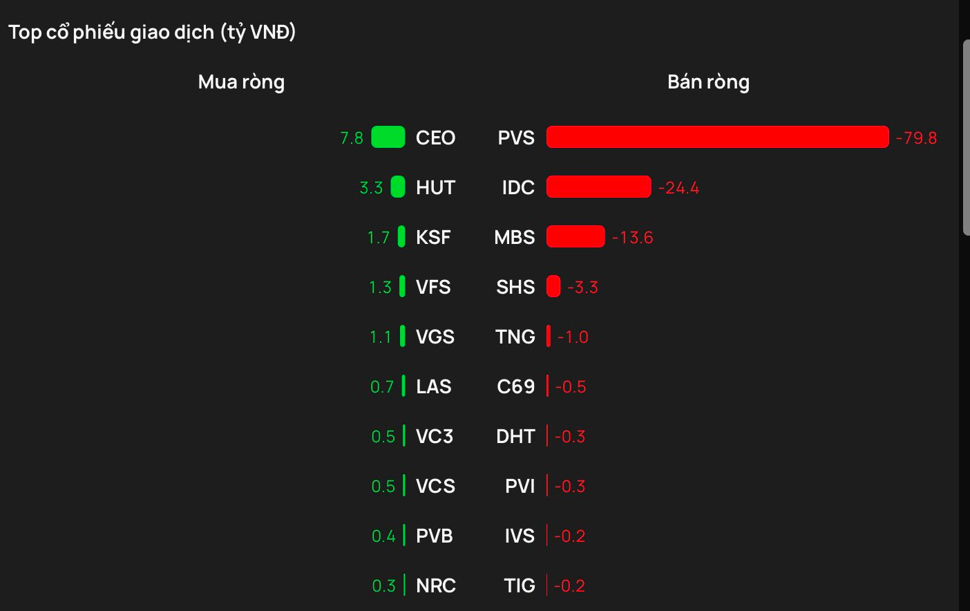 Chiều ngược lại, PVS là mã chịu áp lực bán ròng của khối ngoại với giá trị gần 80 tỷ đồng; theo sau IDC bị bán 24 tỷ, MBS, SHS, TNG bị bán từ vài tỷ đồng.