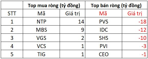 Tại chiều mua, NTP được mua ròng nhiều nhất khoảng 14 tỷ đồng; MBS cũng được mua ròng 9 tỷ đồng; theo sau, VGS, VCS, TIG được mua ròng với giá trị 1-2 tỷ đồng mỗi cổ phiếu.